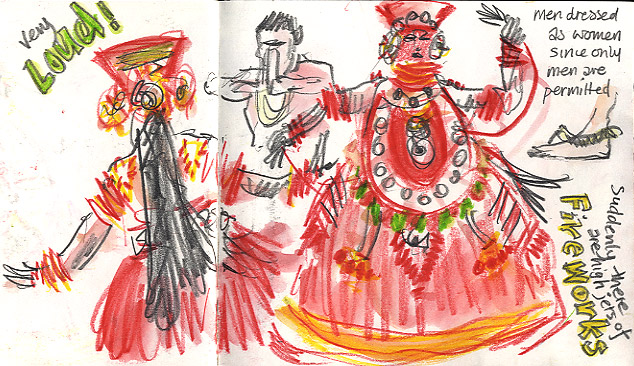 We arrived just as the dancing and drumming was starting. People from all the neighbouring houses were there, sitting around two sides of the garden on plastic chairs. We were immediately shown to seats at the front, which made me feel a little guilty, as unbelievers, but I didn't complain too much, as it also gave me the perfect vantage point to sketch.