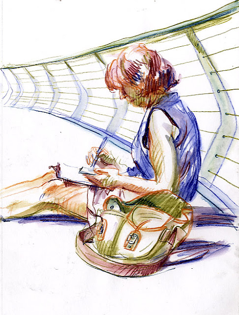 Two fellow SketchCrawlers were nearby, drawing in the shade of a tree, so I hurried to join them, to cool down a bit. We all sat in a row and sketched this man. He looked like he would be pretty still, but he turned out to be a bit of a wriggler!