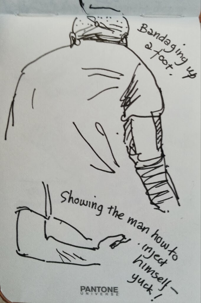As you can see, I took my trusty little A6 sketchbook, like last time. There was lots of hanging about, getting prepped and then waiting for my turn: drawing is the perfect way to both pass the time and keep myself from thinking too much.